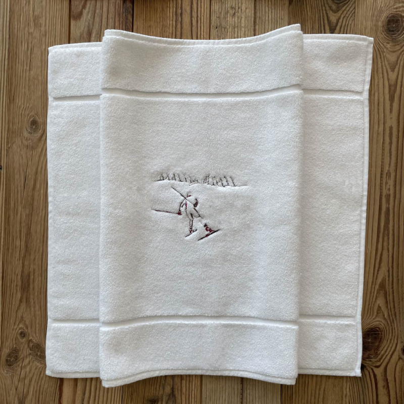 La alfombra de baño blanca con Esquiador de fondo esta hecha 100% en algodón.