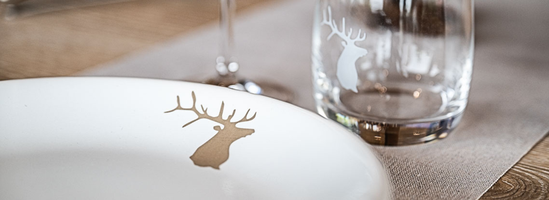 Glasses are of French manufacture and are always coordinated with mountain crockery. Mountain décor glasses are fired at very high temperatures, which allows for intensive use without the silk-screen printing fading. This means that all screen-printed glasses in frosted white, red and grey are dishwasher-safe. Only gold screen-printed glasses must be hand-washed.