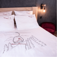 The mountain duvet cover is embroidered with a chairlift and it is made of 100% cotton.