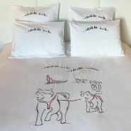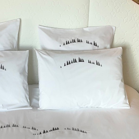 The mountain duvet cover with sled dogs is made of 100% cotton, 200 threads/inch. It is embroidered with four grey sled dogs on a red leash and grey fir trees.