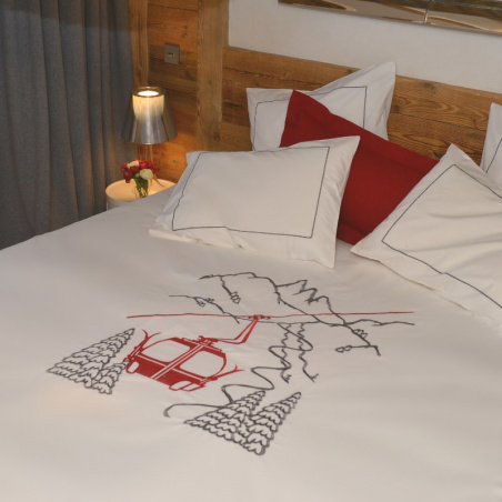 La funda nórdica invierno con teleférico está hecha 100% en percal de algodón, 80 hilos/cm². La funda nórdica invierno esta bordada en el centro con un paisaje que incluye un teleférico rojo, abetos y montañas.