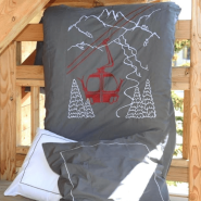 La funda nórdica invierno está bordada con un teleférico rojo, abetos y montañas a lo lejos. Está hecha 100% en percal de algodón.