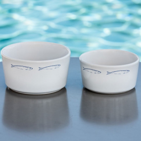 Les ramequins poisson Ø12cm sont vendus par 6. Les ramequins poisson sont en faïence et sont assortis à toute la gamme de vaisselle poisson déco Bord de mer, dessin sardine.