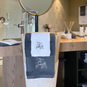 The white shower towel with a Cable car is the towel you need to keep the mountain spirit in your bathroom.