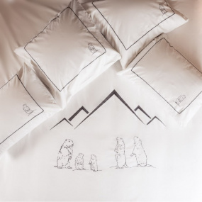 The mountain duvet cover with marmots is made of 100% cotton, 200 threads/inch. It is embroidered with grey marmots and grey mountains.