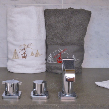 Mantenete l'autenticità del vostro arredamento di montagna con il telo da doccia bianco e il suo ricamo a tema montagna disegno funivia