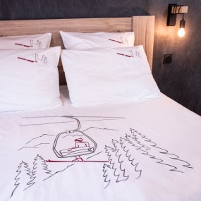 Le federe bianche disegno sci sono ricamate. Si abbinano ai copripiumini con disegno funivia.