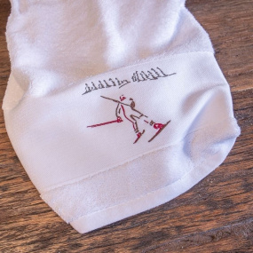 Colore del tessuto: Bianco Colori del ricamo: Grigio, Rosso, cioccolato. Il copripiumino disegno sciatore - sci di fondo è disponibile in diverse misure e potete abbinarlo alla federa bianca ricamata grigia 50 x 80 cm. Aggiungete il lenzuolo bianco per ottenere un completo da letto coordinato.