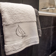 L'asciugamano da bagno barca è ricamato con una barca a vela grigia al centro su un asciugamano di cotone al 100%. Questo asciugamano da barca porterà una decorazione balneare contemporanea alla tua casa.